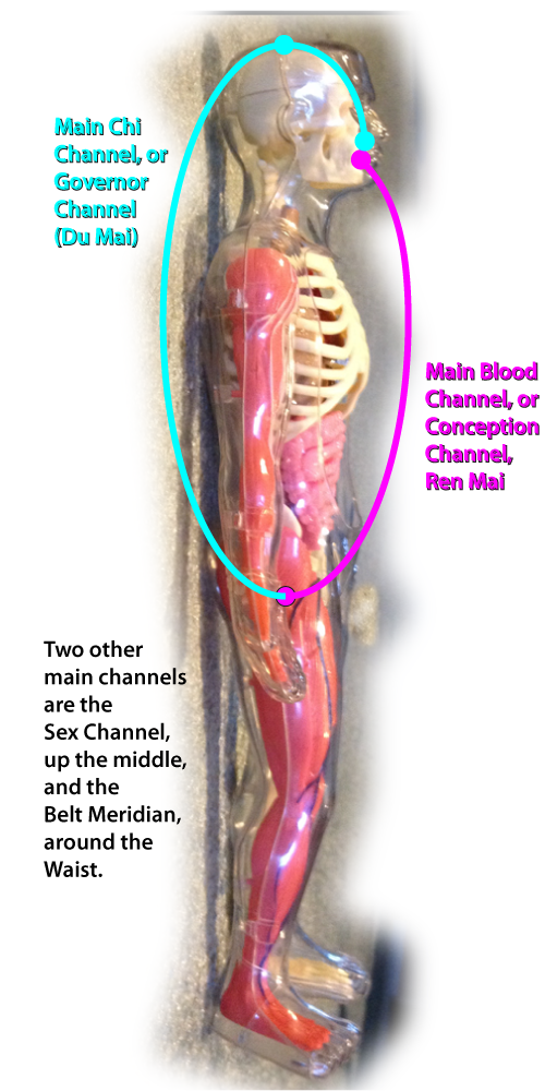TCM Main Channels (Meridians)The Governor Meridian runs along the skin from the Perineum up the spine, over the head through the Most Yang Point, and down to the hard palate just behind the front teeth. The Conception Meridian runs from the Perineum along the front of the body to the tip of the tongue. When the tongue curls slightly at the tip and touches behind the front upper teeth, the circuit is completed and Qi and Blood flow well. When talking the circuit is broken. Hold a slight tension in the Perineum to keep the essences from "dripping out" the bottom of the loop. The Qi and Blood can circulate in either direction, and to force it to change in either direction is thought to be unnatural. This energy loop is called the Microcosmic Orbit, because Qi and Blood are thought to be like the Sun and Moon moving relative to the earth, and the Human Body is like a universe in miniature. This is why the 9 Palaces Map is also used for Feng Shui, enabling practitioners to adjust living spaces according to the same universal principles which govern the human body and its organs. |