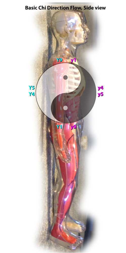 TCM Chi Flow Side ViewIn reverse direction, cooling occurs. This can be done naturally, as when the body gets ready for sleep, or deliberately, as a meditative exercise. |