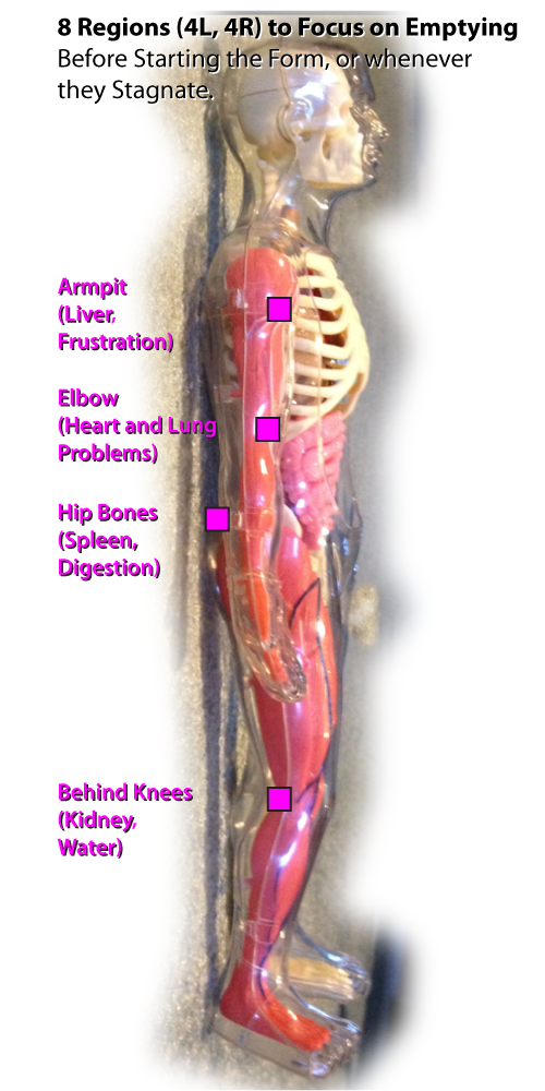 TCM Eight Vessels to EmptyEnergy stuck in these vessels (4 left, 4 right) cause health problems. Actively release them before and while doing the Tai Chi or QiGong forms. |
