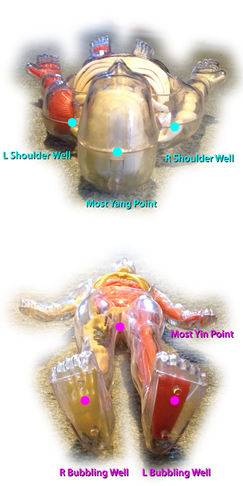 TCM Basic Acu-PointsThe Most Yang Point (Ba Gua, "Bah-Guey") is where 100 yang lines (all yang paths of the body) meet. There is another such point, at the big bone protruding at the vertebra at the base of the neck. The Bubbling Well points are where the Human Essence begins to emerge from the Earth's energy. The Most Yin Point (Hui Yin, Perineum, the point between anus and genitals) is the starting and ending point for all energy in all QiGong exercises, says Professor Limin Qu. The Shoulder Well points (where the Clavicle is felt between the shoulder muscles) on either side is the most important Health Maintenance Point in gigong. The basic exercise for "moving the stuck (tight) energy in the Shoulder Wells" is slow shoulder rotation exercise. On each side of the body, the Bubbling Well is where our Personal Energy starts, and the Shoulder Well is the peak of our Personal Energy. Professor Qu Limin says, "If you align the Bubbling Well Points with the Shoulder Well Points of both sides, and the Most Yin Point with the Most Yang Point while standing, this is better than doing the exercise form 100 times." |